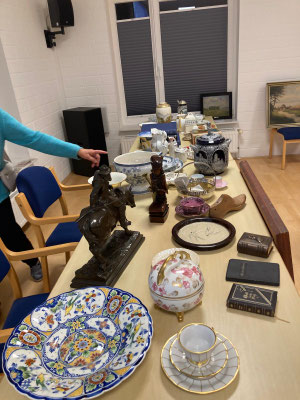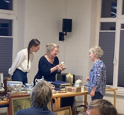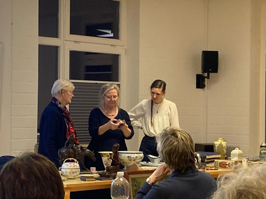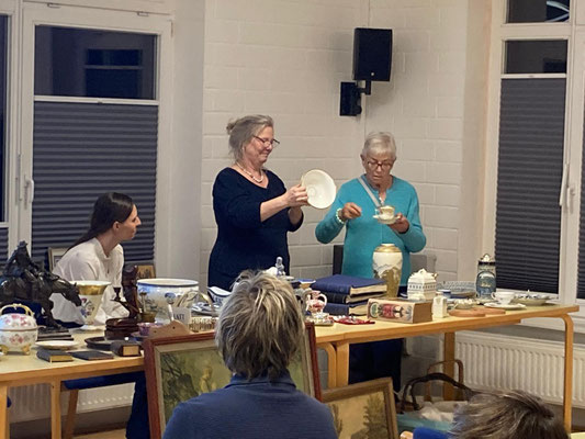 An diesem Abend hatten wir im Bürgerhaus in Grundhof Besuch von Fau Ines Wiechmann. Sie betreibt zusammen mit ihrer Tochter Merle Sayers ein Antiquitätengeschäft in Kappeln. In der Einladung zu diesem Abend waren die Besucher aufgefordert worden, z. B. altes Porzellan, Schmuck, Bilder oder Briefmarken mitzubringen, damit Frau Wiechmann diese schätzen konnte. Die Gäste an diesem Abend waren dieser Aufforderung gerne nachgekommen und so gab es einen ganzen Tisch voller "Schätze und Antiquitäten“. Jedes Teil wurde von Frau Sayers begutachtet und der Besitzer erzählt seine Geschichte zu seinem Gegenstand.