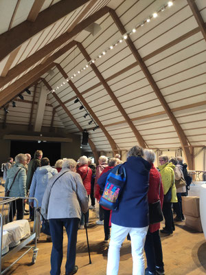 Wenn man in Flensburg am Theater arbeitet, muss man gut zu Fuß sein. Es geht viele Treppen hoch und runter und viele schmale Gänge hin und her. Als Besucher verliert man schnell die Orientierung. Es ging jetzt in die Maske. Hier arbeiten fünf Maskenbildner. Jeder neue Schauspieler wird von Kopf bis Fuß vermessen. Um z. B. für die Operette „Die Fledermaus“ auf die Bühne zu gehen, muss der Schauspieler/Sänger vorher 1 ½ bis 2 Stunden in die Maske. Dann gibt es in Flensburg zwei Schneidereien, die Herren- u. die Damenschneiderei mit bis zu sieben Näherinnen. Der Kostümbilder hat Vorstellungen von einem Kostüm und macht davon Zeichnungen. Der Gewandmeister muss dann diese Zeichnungen umsetzen. Fast alle Kostüme werden vor Ort genäht, denn normale Kleidung von der Stange würde den Anforderungen nicht Stand halten. Zum Schluss durften wir auch noch in den sehr sehenswerten Kostümfundus.